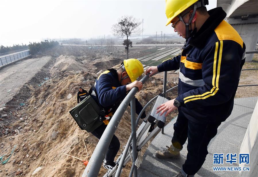 1月3日,中國鐵路濟(jì)南局臨沂工務(wù)段工程技術(shù)員在沂河特大橋橋墩上檢查。新華社記者 朱崢攝