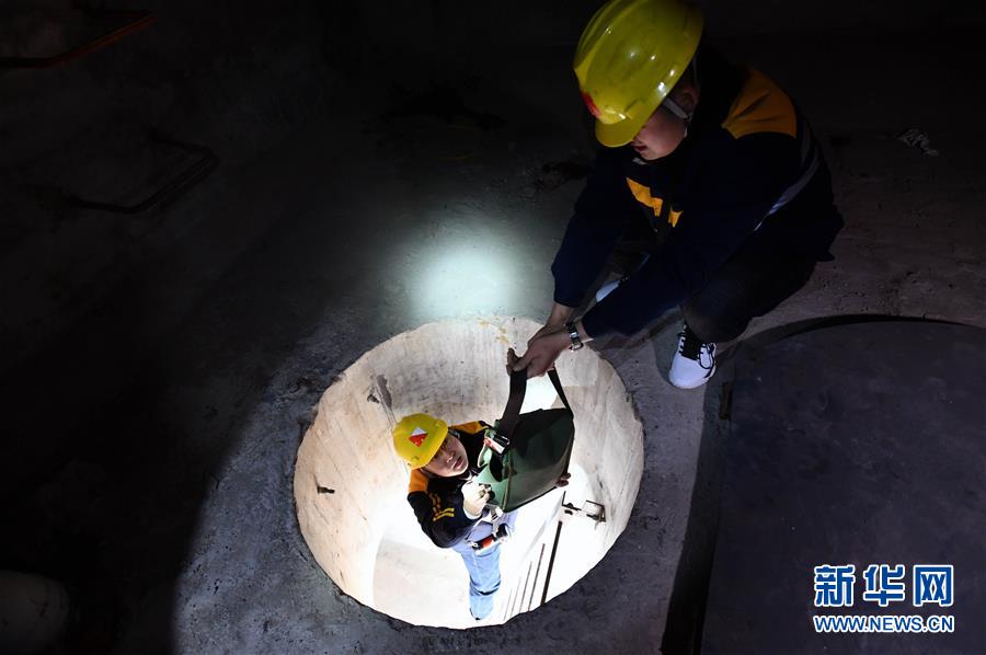1月3日,中國鐵路濟(jì)南局臨沂工務(wù)段工程技術(shù)員通過狹小的檢查孔進(jìn)入箱梁檢查。新華社記者 朱崢攝