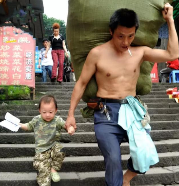 2010年,父親節(jié)那天,攝影師許康平在重慶用鏡頭拍攝下一對(duì)扛貨父子的照片。照片中的父親冉光輝扛著一大編織袋貨物,一手抓著袋子的一角,一手牽著時(shí)年只有三歲的兒子冉俊超,赤裸上身,踏著涼鞋,叼著香煙,從容淡定的走下梯坎。