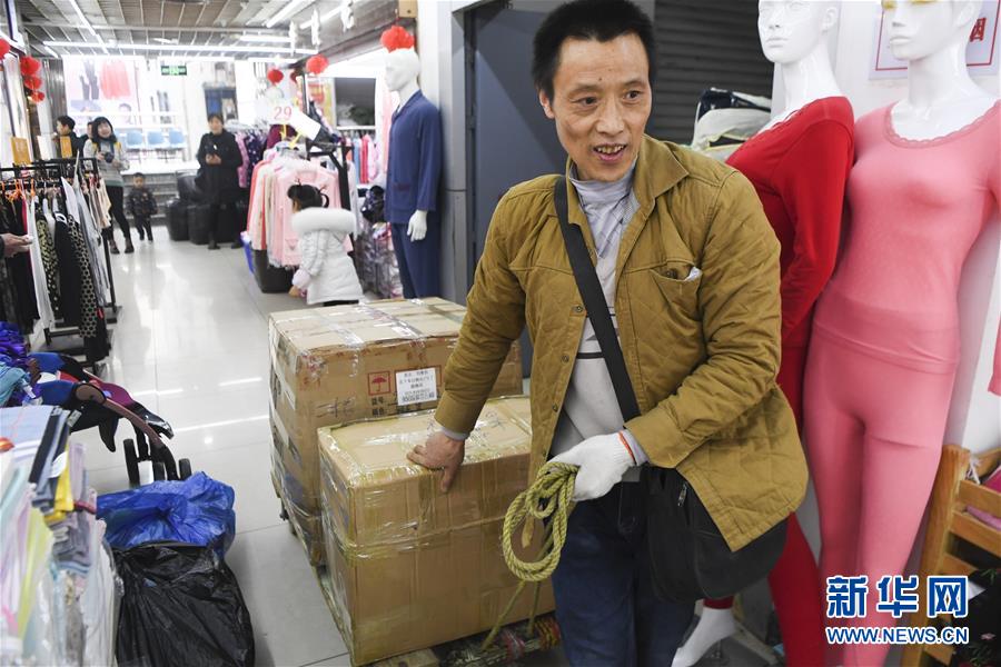 冉光輝在重慶朝天門(mén)大正商場(chǎng)內(nèi)整理即將搬運(yùn)的貨物(1月5日攝)。新華社記者王全超攝