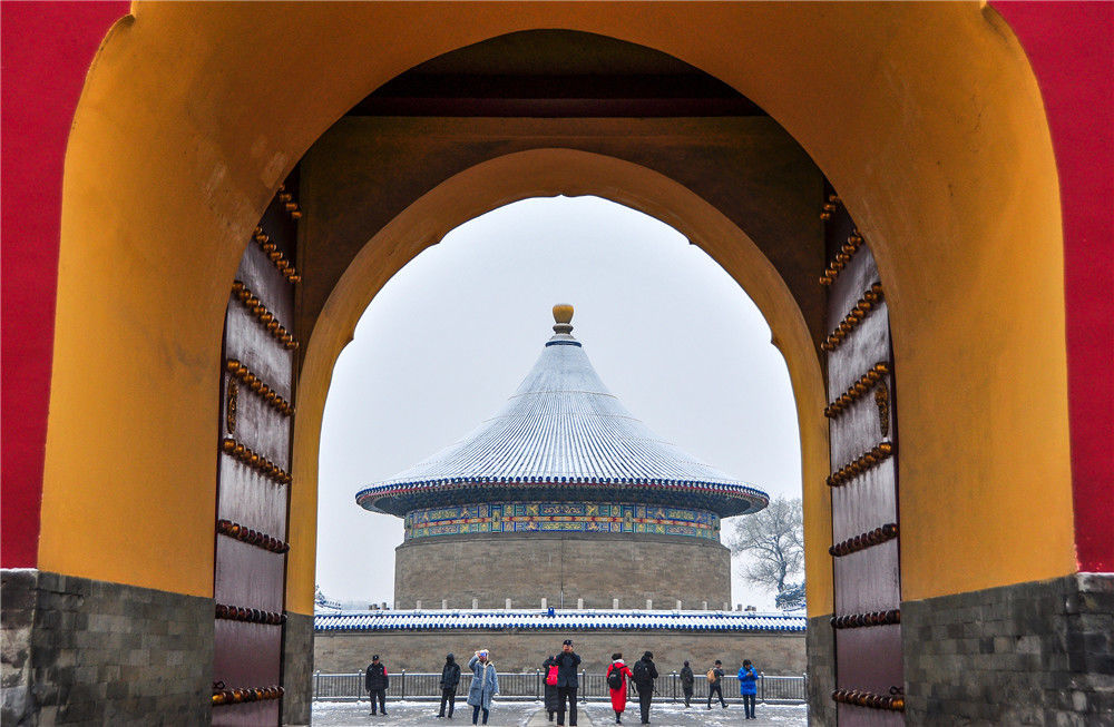 2019年11月30日,北京,初雪過后,天壇公園銀裝素裹,白雪古建相互映襯,景色迷人。時(shí)永平/千龍圖像/視覺中國(guó)