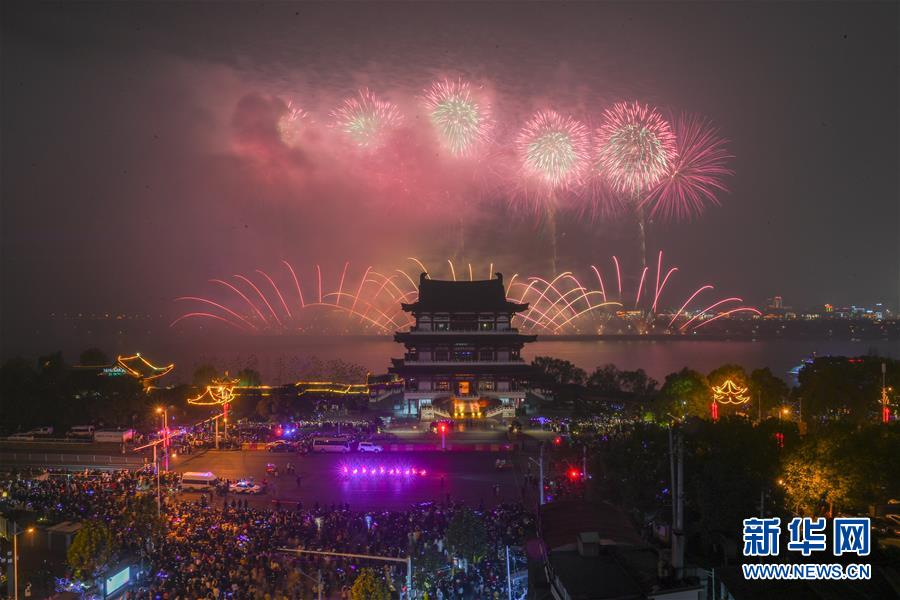 2020年1月1日晚,市民和游客在湖南長沙杜甫江閣前觀看焰火晚會。 當(dāng)晚,湖南長沙在橘子洲舉行音樂焰火晚會慶祝元旦,吸引眾多市民和游客前往觀看。 新華社記者 陳澤國 攝