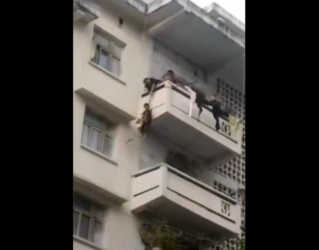 一只貓跑到了百順街老百貨公司宿舍樓三樓的窗戶遮雨臺上,被5樓的老太太發(fā)現,老太太善心發(fā)作,竟將孫子用繩子吊起,從5樓慢慢放至3樓救貓,整個過程不禁令人捏汗。