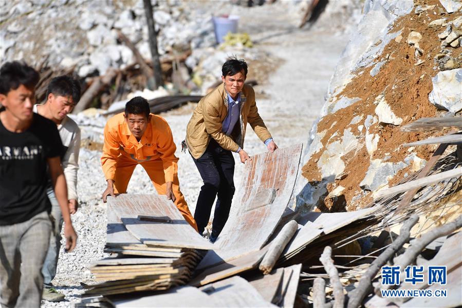 八好村駐村第一書記韋德王(右一)和群眾一起搬運木板,準(zhǔn)備修建水柜(2019年12月16日攝)。新華社記者黃孝邦攝