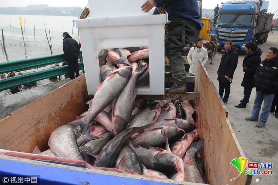 八里河冬捕與其他地方的捕魚(yú)方式不同,漁民們提前一個(gè)月的時(shí)間駕駛小船,自東向西驅(qū)逐魚(yú)群,漸漸地會(huì)把近兩萬(wàn)畝水面的魚(yú)群都聚攏到碼頭附近一百多畝用圍網(wǎng)柵起來(lái)的區(qū)域。據(jù)當(dāng)?shù)貪O場(chǎng)負(fù)責(zé)人介紹“為了賣(mài)出好價(jià)格,今年與往年一樣,先根據(jù)市場(chǎng)行情確定底價(jià),然后通過(guò)招投標(biāo)方式確定銷(xiāo)售商?!苯衲?,為了吸引更多的人們來(lái)八里河參與冬捕活動(dòng),八里河漁場(chǎng)在活動(dòng)當(dāng)天會(huì)拿出3萬(wàn)斤鮮魚(yú)供市民選購(gòu)。