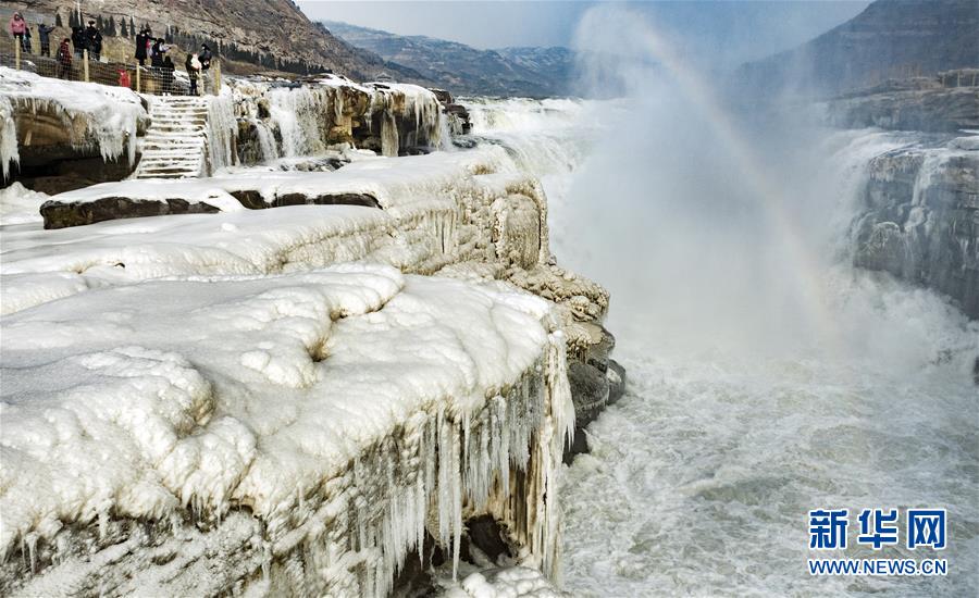1月12日,冰雪下的黃河壺口瀑布在晨光中顯現(xiàn)一道美麗的彩虹(無人機照片)。新華社記者陶明攝