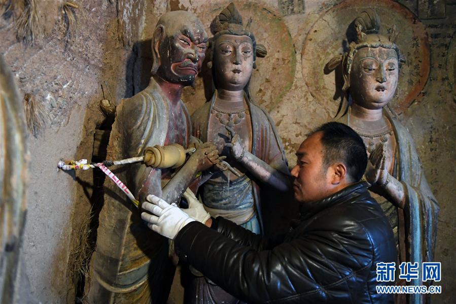12月25日,在麥積山石窟第11窟,修復(fù)師牟常有查看一尊已經(jīng)發(fā)生傾斜的塑像。新華社記者馬寧攝