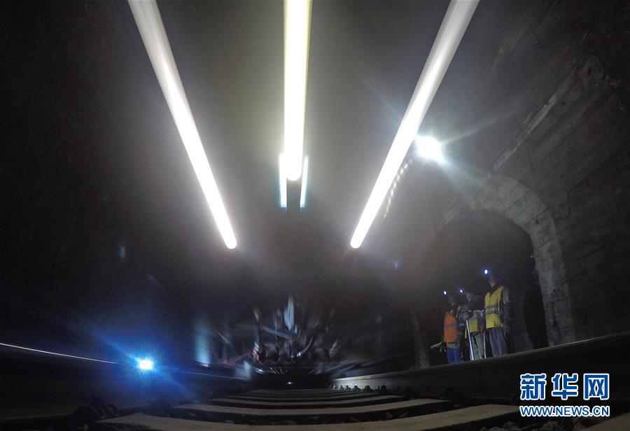 1月9日,在加格達(dá)奇工務(wù)段西羅奇嶺二號隧道,西羅奇維修工隊工作人員在避車洞內(nèi)躲避列車。新華社記者王毓國攝