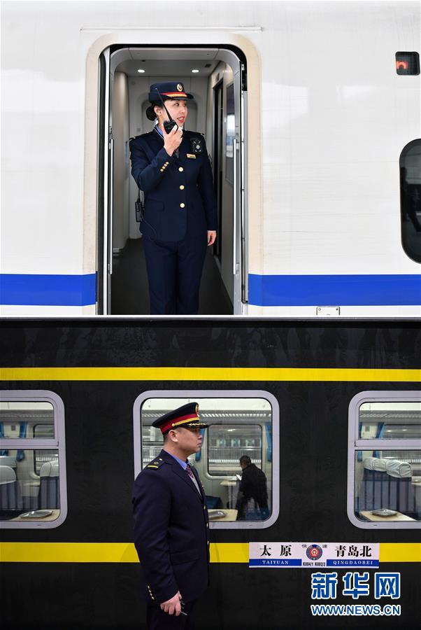 拼版照片上圖:在運(yùn)城北站,列車長陳海燕確認(rèn)旅客上車后通過對講機(jī)通知司機(jī)關(guān)閉車門(新華社記者詹彥1月11日攝);下圖:在太原站,列車長趙耀在列車出發(fā)前檢查巡視(新華社記者楊晨光1月11日攝)。新華社發(fā)