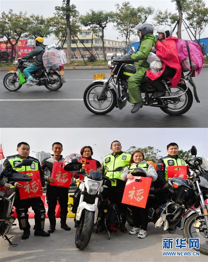 拼版照片:上圖是江西、安徽和湖北籍農(nóng)民工組成的返鄉(xiāng)“鐵騎大軍”騎行在返鄉(xiāng)路上(2014年1月23日攝);下圖是“90后”外來(lái)務(wù)工返鄉(xiāng)青年冉曉紅(左三)和騎友們?cè)谥惺驼闹蔟埥芳佑驼竞嫌傲裟睿?月15日攝)。20歲的冉曉紅是重慶人,在福建廈門從事餐飲業(yè),2019年買了一輛高檔摩托車,2020年與朋友結(jié)伴騎摩托車返鄉(xiāng),路上預(yù)計(jì)需要五天時(shí)間。 新華社記者 魏培全 攝