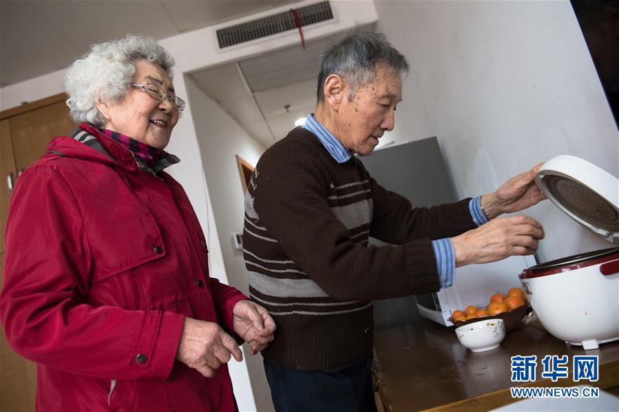 1月17日,王育華(左)和丈夫李偉光在杭州市社會福利中心宿舍吃午飯。新華社記者 翁忻旸 攝
