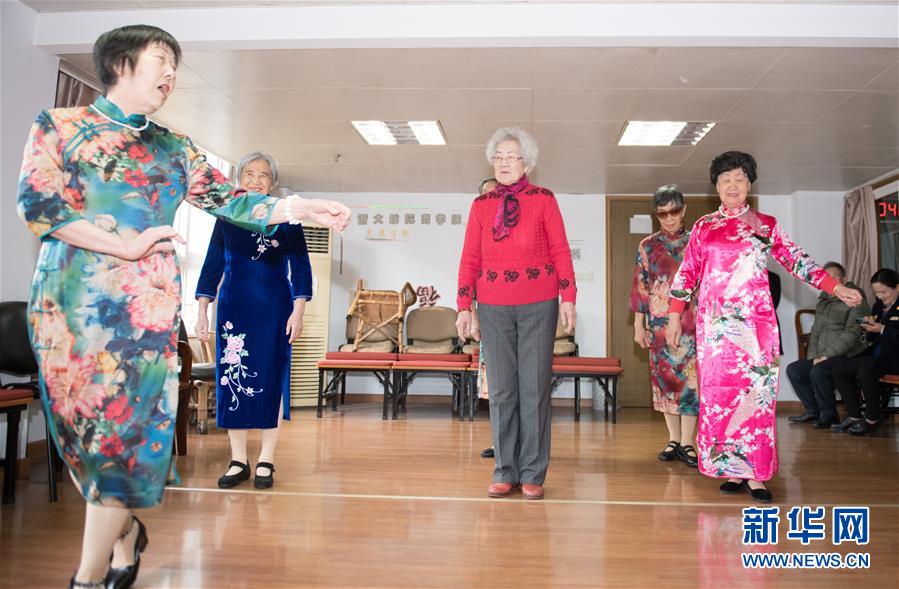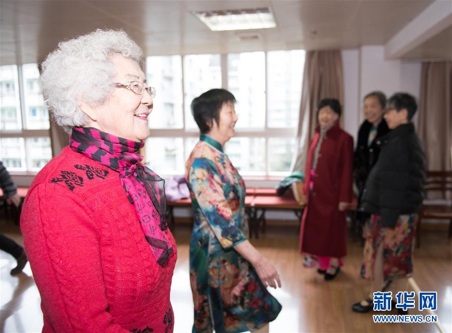 1月17日,王育華(前)帶著模特隊的隊員在杭州市社會福利中心音樂教室唱《茉莉花》。