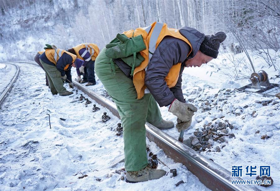 1月7日,西羅奇維修工隊(duì)工作人員在加格達(dá)奇工務(wù)段西羅奇嶺二號(hào)隧道附近進(jìn)行維修作業(yè)。新華社記者才揚(yáng)攝