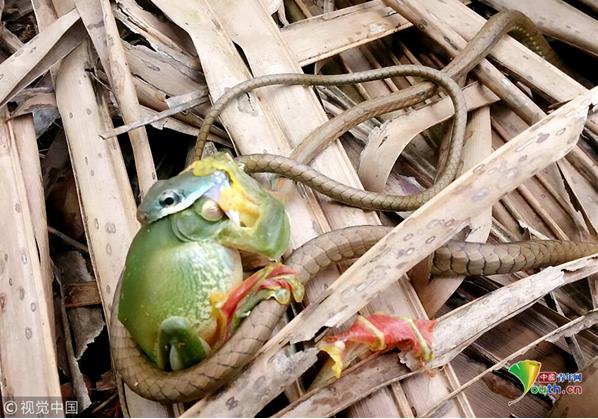 印度喀拉拉邦,一條大眼樹蛇非常貪婪地一口吞下了一只長(zhǎng)約10厘米的青蛙,只剩青蛙兩只腿在外掙扎。28歲的捕蛇人Sujith VP拍下這一過程。