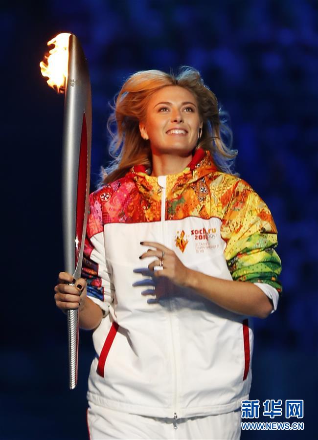 圖為2014年2月7日,莎拉波娃在索契冬奧會(huì)開(kāi)幕式上手持火炬進(jìn)行傳遞。 新華社記者王麗莉攝