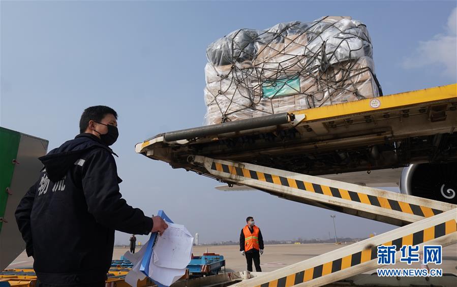 1月28日,滿載醫(yī)療防疫物資的貨運(yùn)飛機(jī)在武漢天河機(jī)場(chǎng)卸貨。新華社記者 程敏 攝