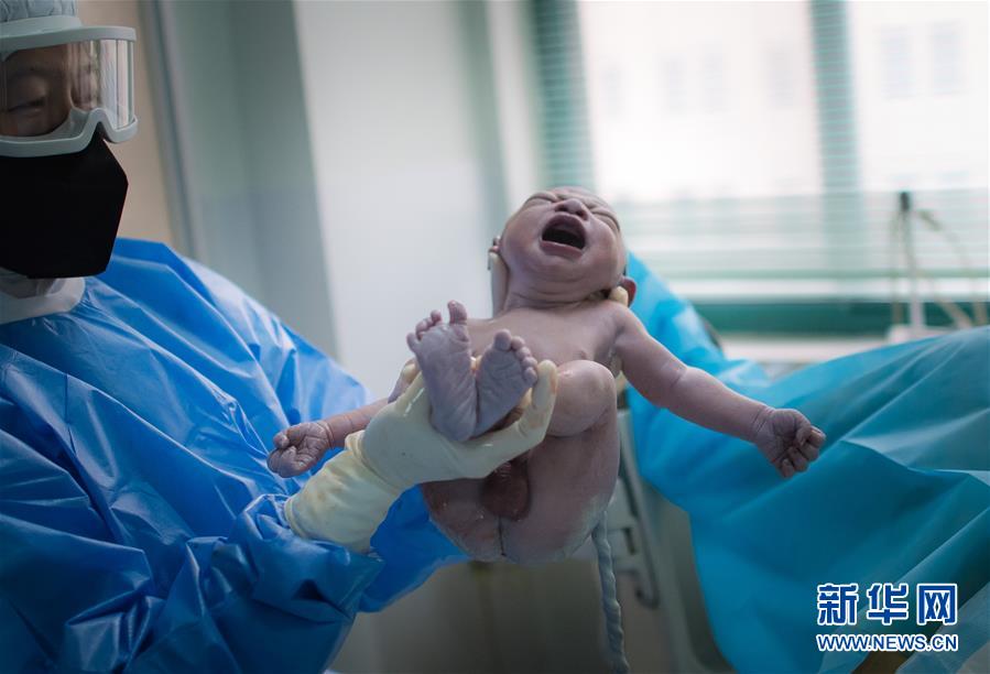 3月1日下午,在武漢市婦幼保健院分娩室,助產(chǎn)士吳丹將新出生的寶寶抱給產(chǎn)婦劉婷看。新華社記者 肖藝九 攝