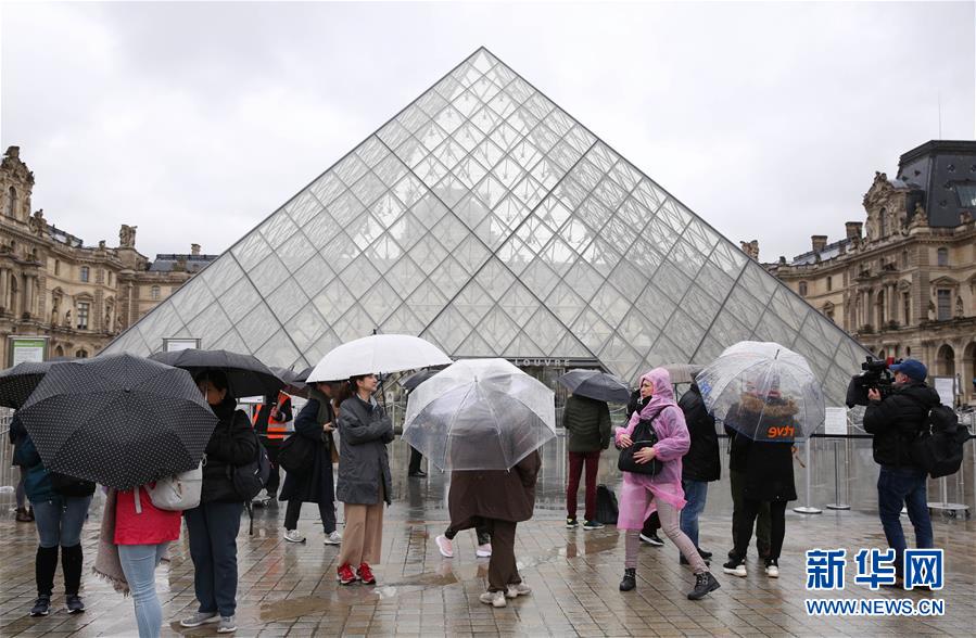 3月2日,在法國(guó)巴黎,游客撐傘走過盧浮宮的玻璃金字塔。新華社記者 高靜 攝