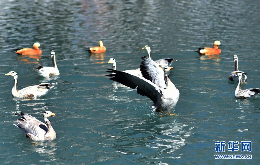 拉薩宗角祿康公園湖中嬉戲的鳥兒(3月10日攝)。 隨著氣候回暖,西藏的春天悄然到來。在“日光城”拉薩,高原大地從寒冬中漸漸醒來。 新華社記者 覺果 攝