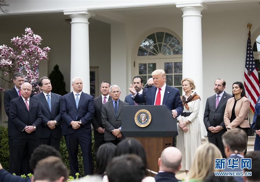3月13日,美國總統(tǒng)特朗普(中)在華盛頓白宮的記者會上講話。特朗普當天下午在白宮發(fā)表講話時正式宣布“國家緊急狀態(tài)”。他說,此舉旨在讓美國聯(lián)邦政府全力投入到抗擊新冠肺炎疫情的努力中。這項舉措將釋放500億美元資金,幫助各州和地方政府應(yīng)對疫情。新華社記者劉杰攝