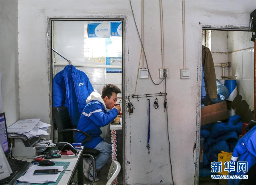 3月12日,李杰利用午休間隙在廠洼路網(wǎng)點吃午飯。新華社記者張玉薇攝