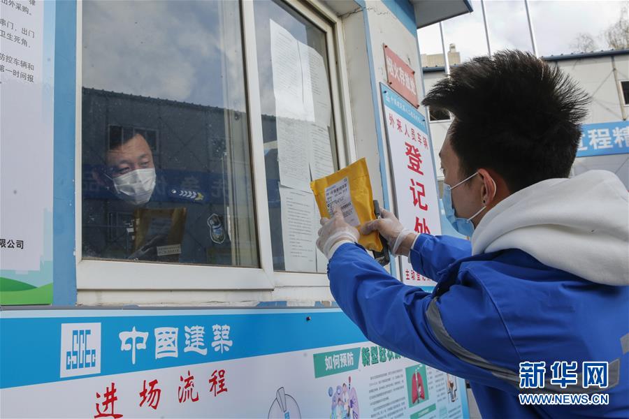 3月12日,李杰(右)在一個(gè)投遞點(diǎn)向傳達(dá)室工作人員詢問收件人的信息。新華社記者張玉薇攝