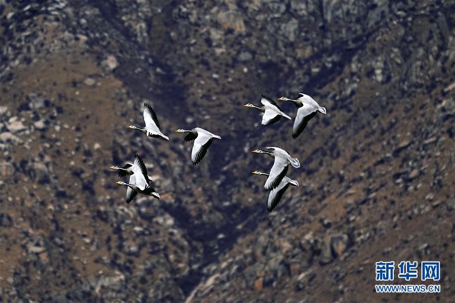 3月14日,斑頭雁在拉魯濕地上空飛翔。新華社記者詹彥攝