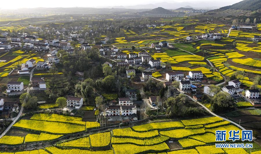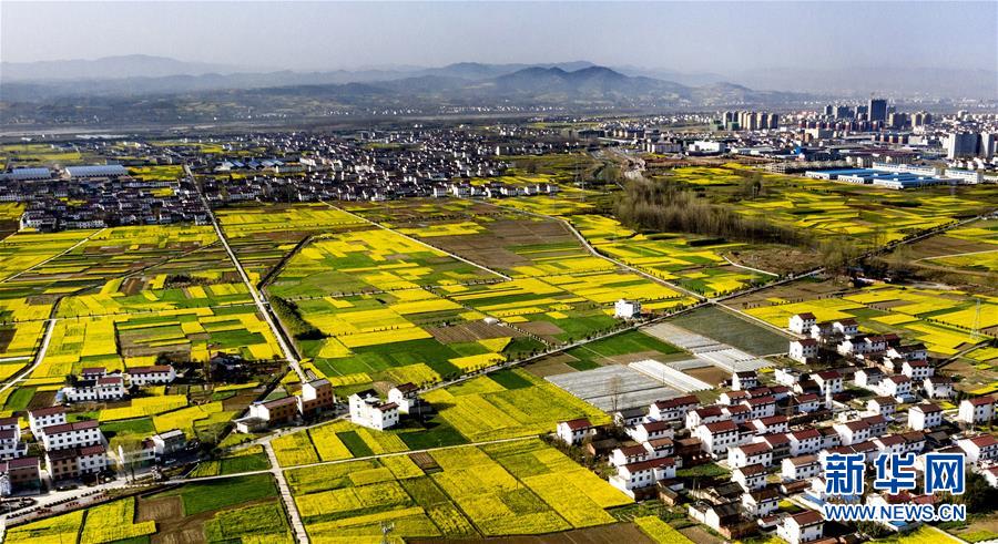 3月14日,洋縣龍亭鎮(zhèn)柳山村盛開的油菜花與村舍構成美麗的圖畫(無人機照片)。 新華社記者陶明攝