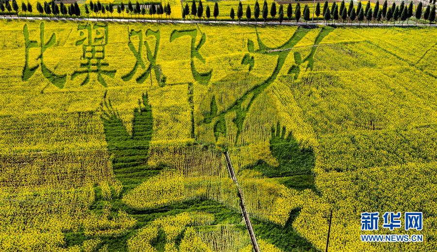 3月14日拍攝的洋縣紙坊街道龍山觀花點創(chuàng)意種植的“相守一生”油菜花景觀(無人機照片)。 新華社記者陶明攝