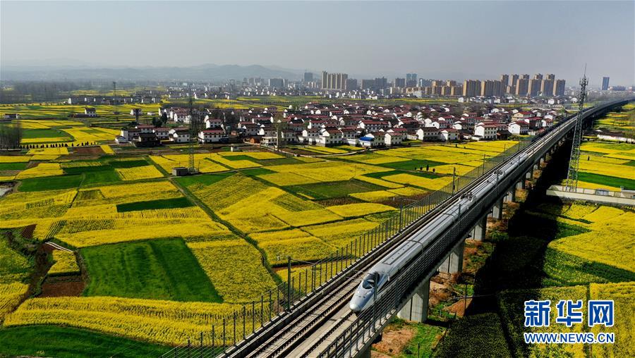 3月14日,一列動車從洋縣油菜花海中駛過(無人機照片)。 新華社記者陶明攝