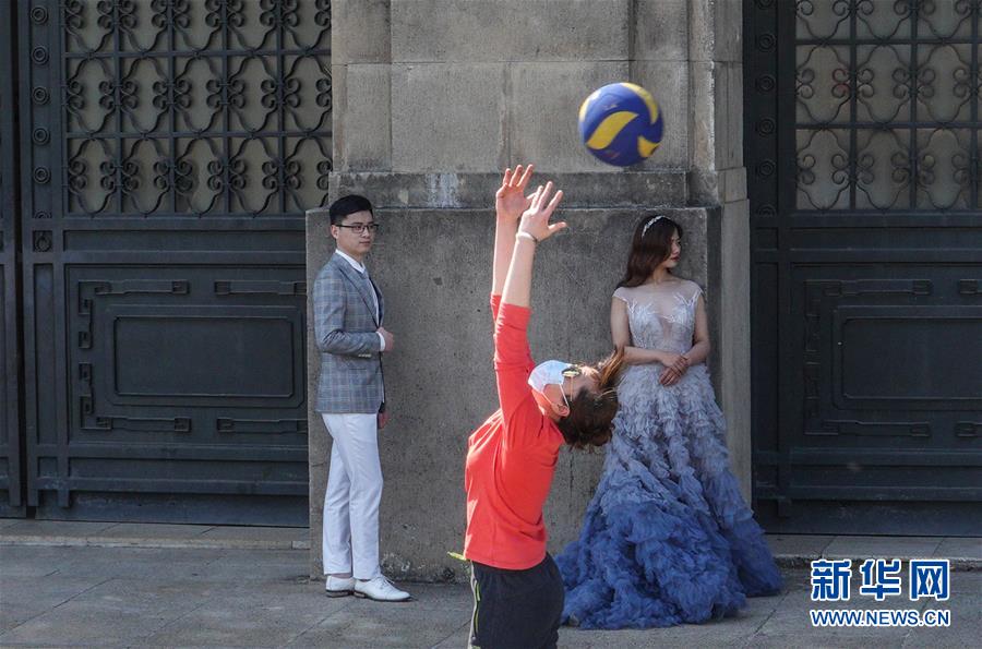 3月15日,在南京東郊體育公園,一對新人在一名練習(xí)排球的市民旁拍攝婚紗照。 當(dāng)日,南京風(fēng)和日麗,市民們來到東郊體育公園,踏青春游。 新華社記者 楊磊 攝