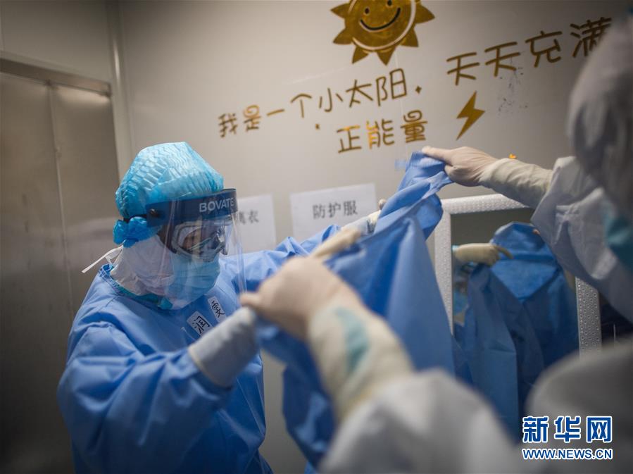 3月19日,在武漢市肺科醫(yī)院清潔區(qū),浙江醫(yī)療隊(duì)隊(duì)員在穿戴防護(hù)服。 新華社記者 肖藝九 攝