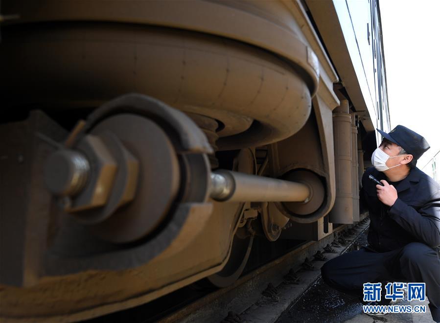 3月19日,鄭州車輛段庫檢車間值班主任張伯季在對客車下部設施進行檢查。新華社記者 李安 攝