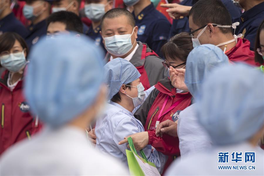 3月21日,武漢市第一醫(yī)院的護(hù)士長杜沛(中左一)與天津市醫(yī)療隊(duì)隊(duì)員道別。杜沛是負(fù)責(zé)與天津市醫(yī)療隊(duì)對接的護(hù)士長。新華社記者費(fèi)茂華攝