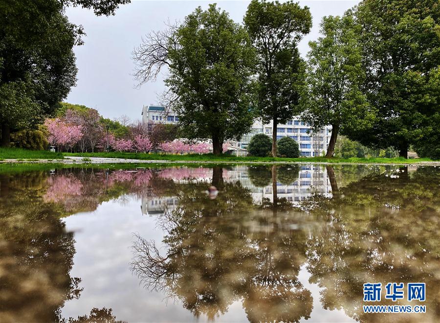 近日,隨著氣溫上升,武漢大學(xué)圖書館附近一片櫻花開放。新華社記者費茂華攝