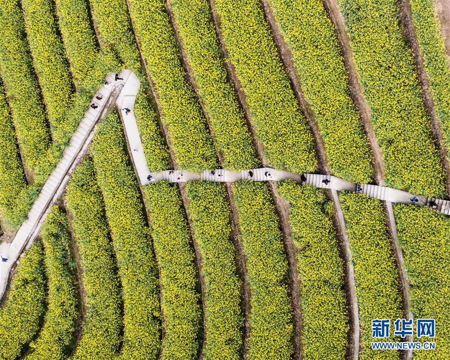 3月25日,游客游覽新登鎮(zhèn)上旺村黑山頂近百畝的油菜花海(無人機(jī)照片)。新華社記者徐昱攝