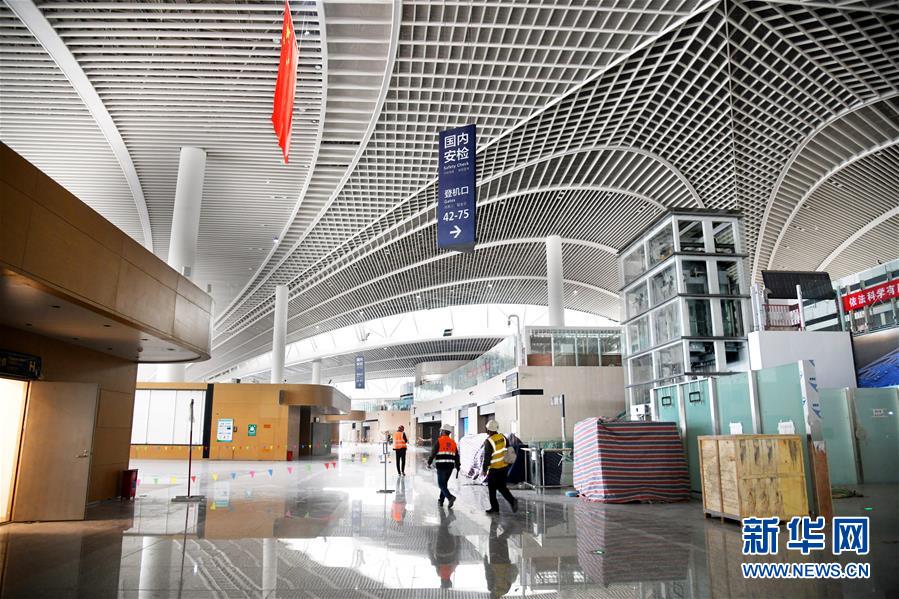 3月25日,兩名工人從建設中的青島膠東國際機場航站樓出發(fā)大廳走過。新華社記者李紫恒攝