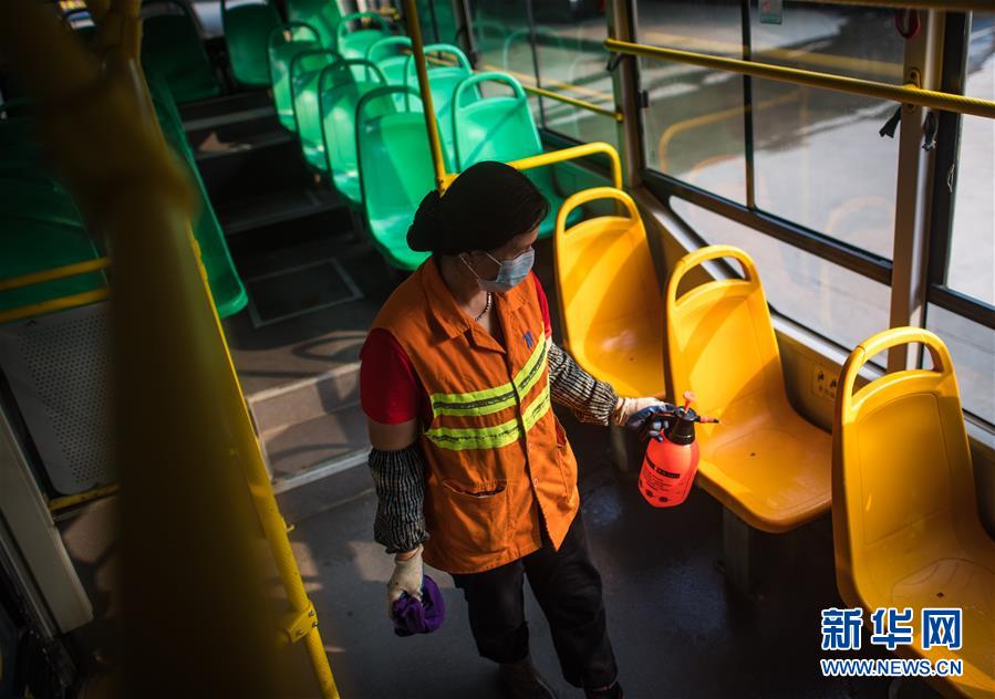 3月23日,武漢公交集團站務公司保潔員趙真香在為一輛公共汽車消毒清洗。新華社記者肖藝九攝