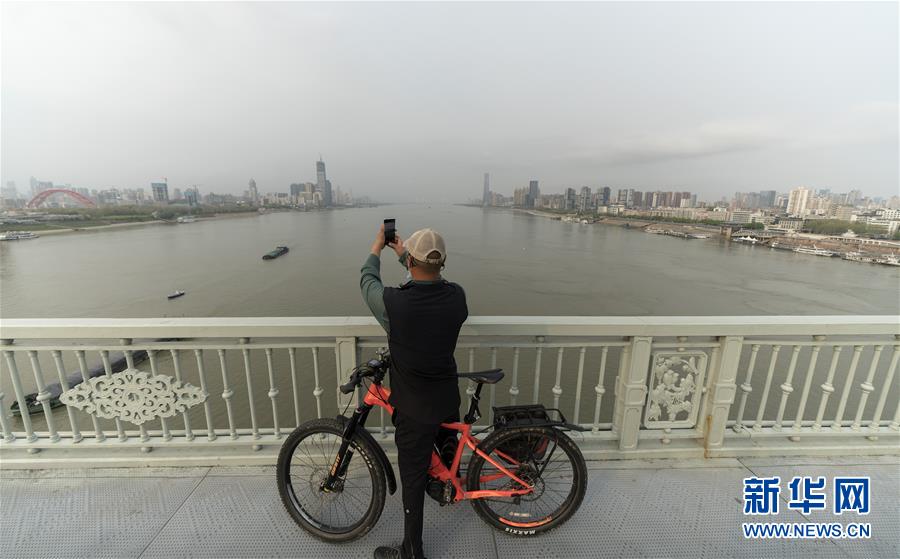 3月25日,在武漢長江大橋,一名騎行的市民停下來拍照。新華社記者費(fèi)茂華攝