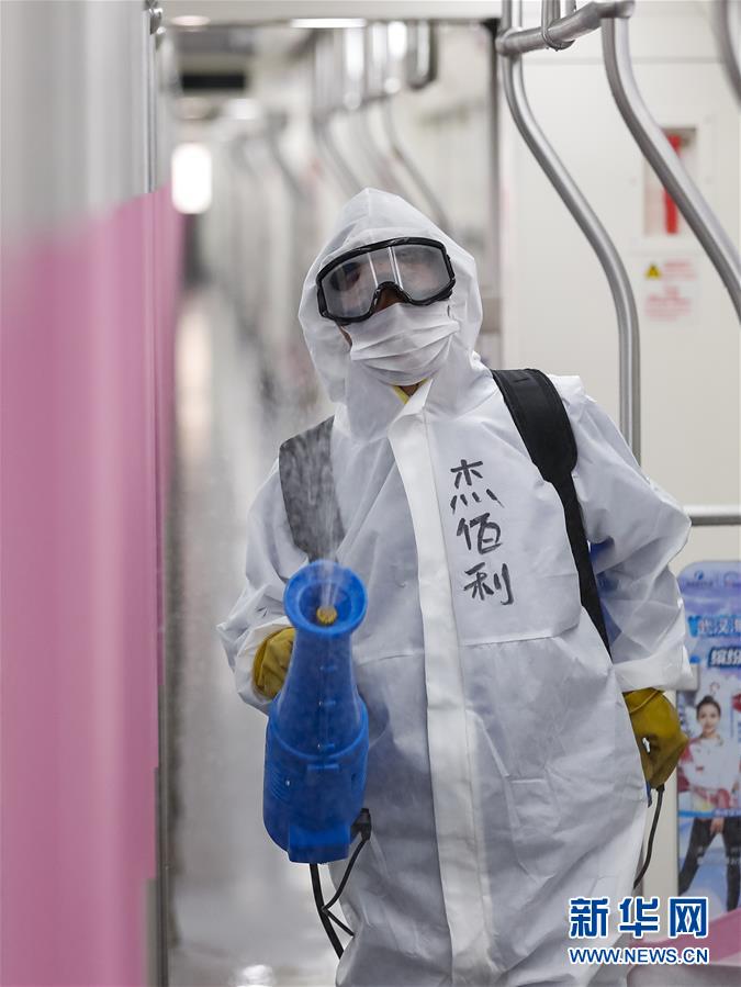 3月23日,在武漢地鐵常青車(chē)輛段,保潔人員為地鐵列車(chē)消毒。新華社記者沈伯韓攝