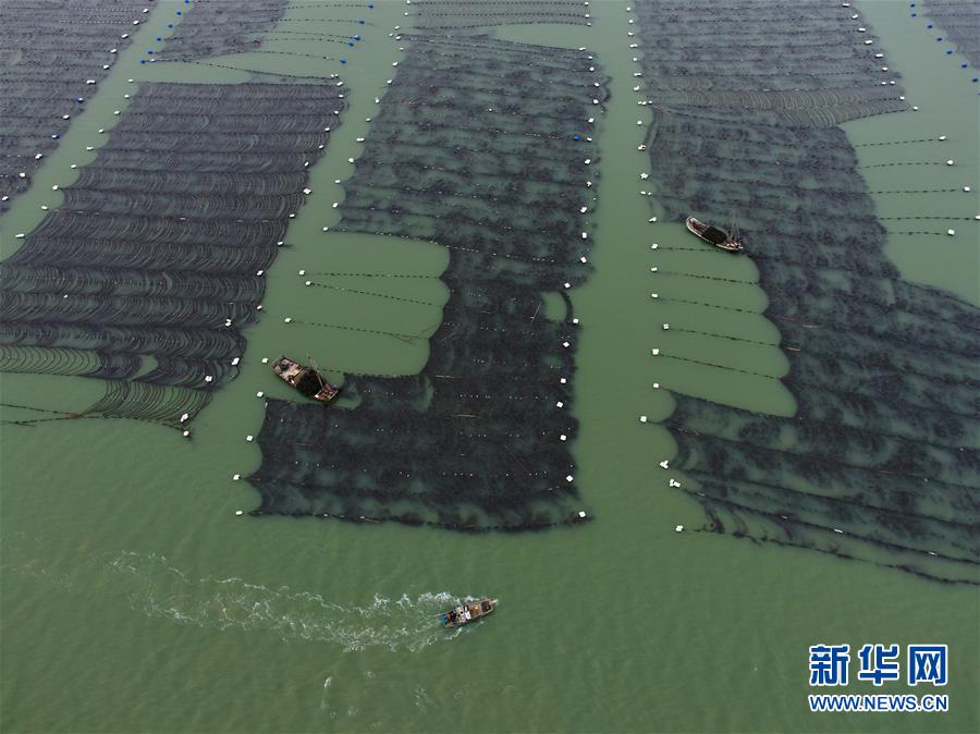 4月10日,霞浦縣長春鎮(zhèn)海域,海帶養(yǎng)殖戶在用船只收獲海帶(無人機(jī)拍攝)。新華社記者姜克紅攝