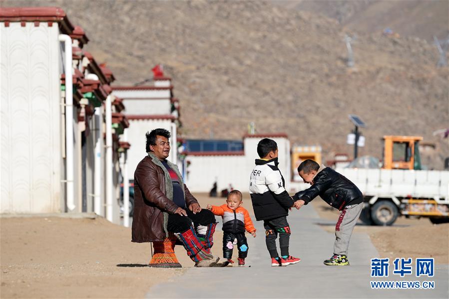 在拉薩市堆龍德慶區(qū)古榮鄉(xiāng)榮瑪高海拔生態(tài)搬遷點,美瓊(左一)和孩子們在家門口玩耍(4月1日攝)。美瓊一家在搬遷點分到一套120平米的房子。美瓊還和朋友合伙在搬遷點的扶貧綜合門面房租了一間店面,開了一家銷售日用品的小商店。新華社記者 詹彥 攝