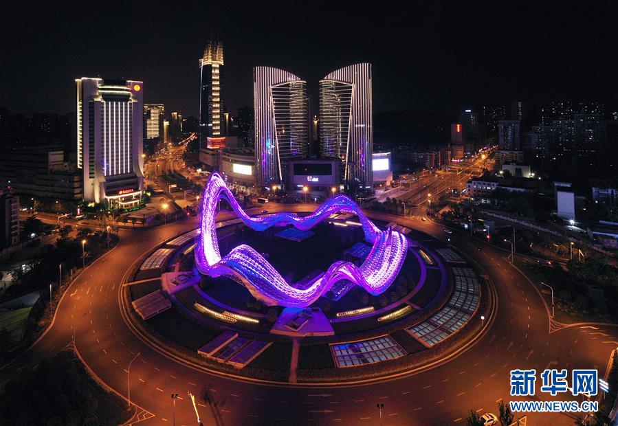 4月7日,武漢光谷環(huán)島開啟燈光秀(無人機(jī)照片)。當(dāng)日,隨著武漢解除離漢通道管控進(jìn)入倒計(jì)時,全市開啟了城市景觀照明,夜色中的武漢美不勝收。新華社記者李賀攝