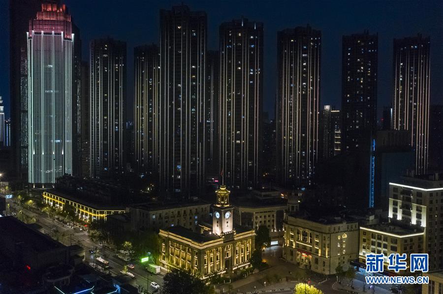 這是4月7日晚拍攝的武漢市江漢關(guān)博物館及附近建筑燈光夜景(無人機(jī)拍攝)。新華社記者沈伯韓攝