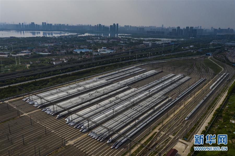 4月7日,在武漢動車段,列車??吭诖孳嚲€上(無人機照片)。新華社記者 沈伯韓 攝