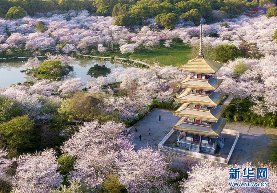 3月20日拍攝的武漢東湖櫻園(無(wú)人機(jī)照片)。 新華社記者 熊琦 攝