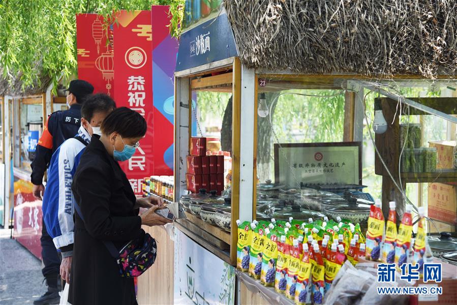 4月13日,游客在濟(jì)南百花洲歷史文化街區(qū)購(gòu)買文創(chuàng)產(chǎn)品。新華社記者王凱攝