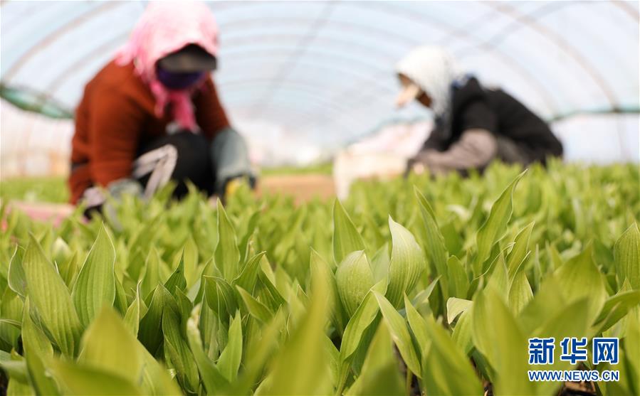 4月13日,在八角臺街道雅化村花圃內(nèi),花農(nóng)為宿根花卉除草。新華社記者姚劍鋒攝