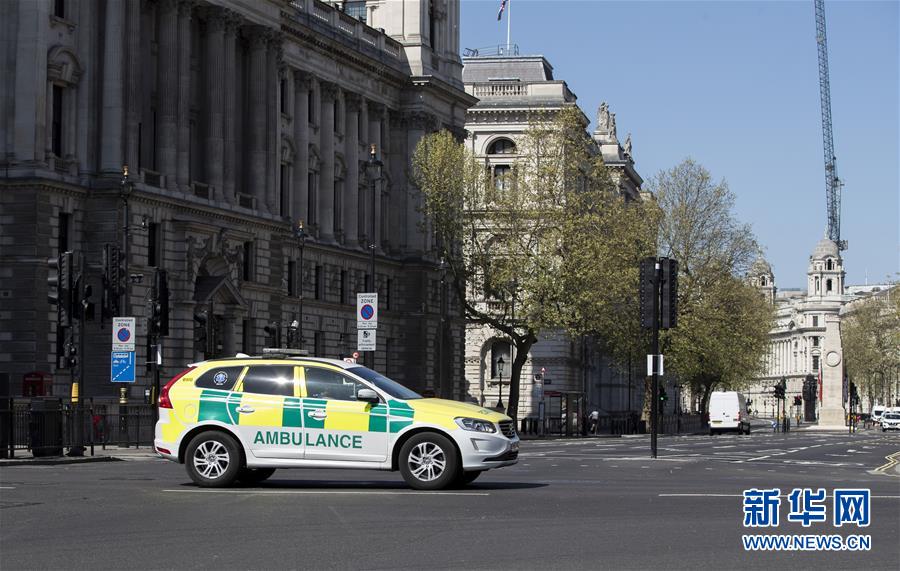 4月14日,在英國倫敦,一輛救護(hù)車從議會(huì)街前駛過。新華社記者韓巖攝