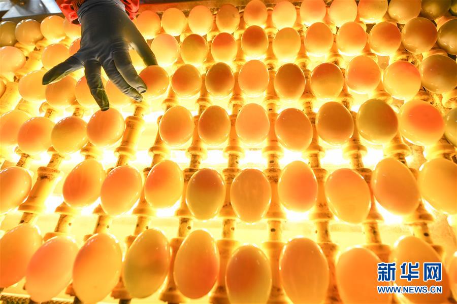江蘇高郵鴨集團的工作人員在生產(chǎn)線上對鴨蛋進行光檢作業(yè)(4月15日攝)?!案哙]鴨蛋”是江蘇高郵的特色農(nóng)業(yè)名片。近年來,當?shù)卦诹挤N繁育、生態(tài)養(yǎng)殖、產(chǎn)品加工等方面加大力度,推動高郵鴨蛋品牌化建設,讓小鴨蛋成為帶動農(nóng)戶致富的大產(chǎn)業(yè)。2019年,高郵市共計生產(chǎn)熟制鴨蛋產(chǎn)品近11.2億枚,年產(chǎn)值近17.68億元。新華社記者李博攝